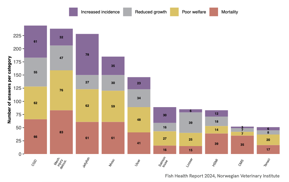 The 10 most important fish health problems of salmon in ongrowing facilities. Categories related to winter wounds include Mvisc (Moritella viscosa infection), Ulcer (skin ulcer, unspecified cause) and Tenaci (Tenacibaculum spp. infection). Source: Fish Health Report 2024, Norwegian Veterinary Institute