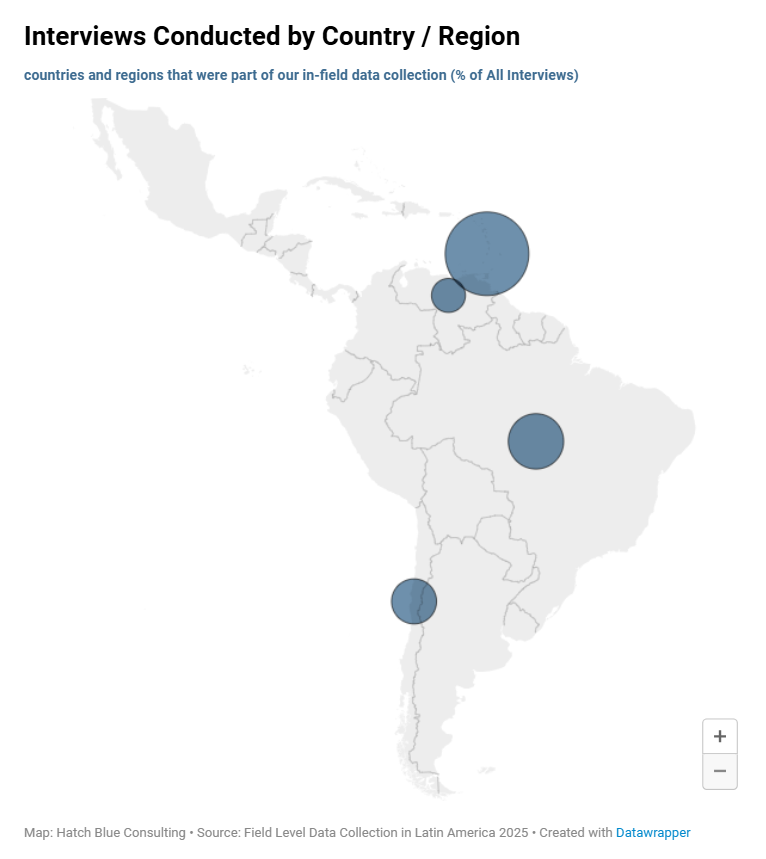 The final study covered six key producing countries, with fieldwork conducted between July and November 2025. Project Manager at Hatch Blue, Karlotta Rieve and her partner, spent 3 weeks on the ground in St. Lucia, St. Vincent and the Grenadines, Grenada and Venezuela during July and August, followed by another 3 weeks across Chile and Brazil during October and November. The team interviewed more than 75 farmers and visited 15 major production sites across 20 farming regions, including 10 islands, capturing data on cultivation practices and supply-chain dynamics.